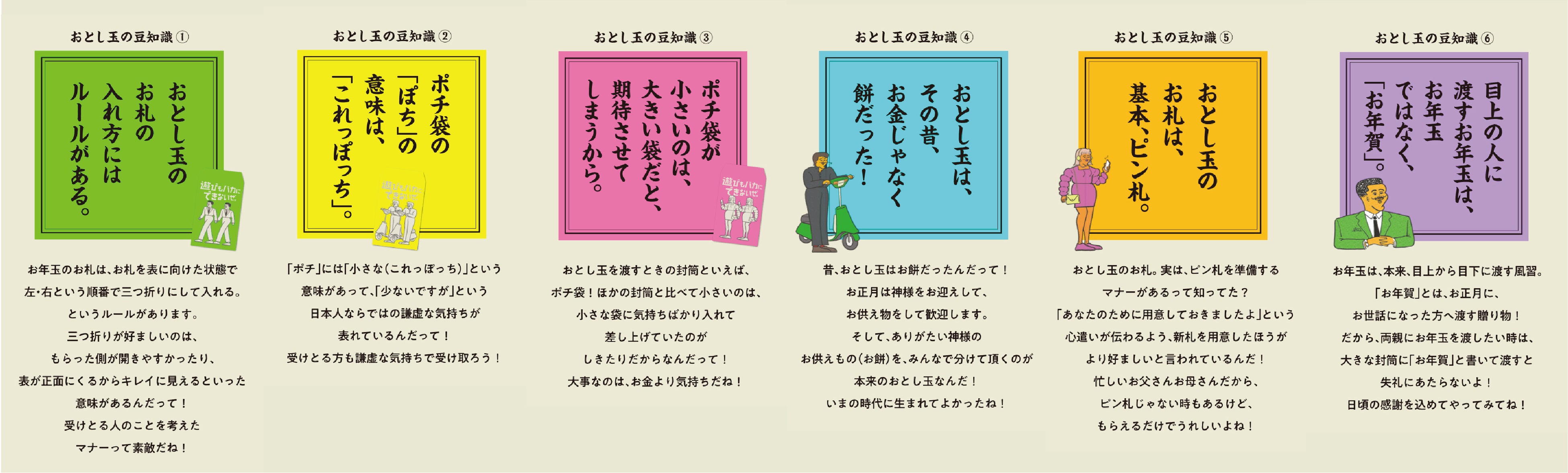 子どもたちにとって、お正月の楽しみのひとつ「おとし玉」。毎年もらえるけど、おとし玉にはいろんな意味があります。そんな意外と知らないおとし玉にまつわる豆知識をポチ袋に掲載。特設サイトでは、詳しい解説、そのほかの豆知識を知ることができます。おとし玉の理解が深まれば、おとし玉のありがたみが、きっとわかるはず!