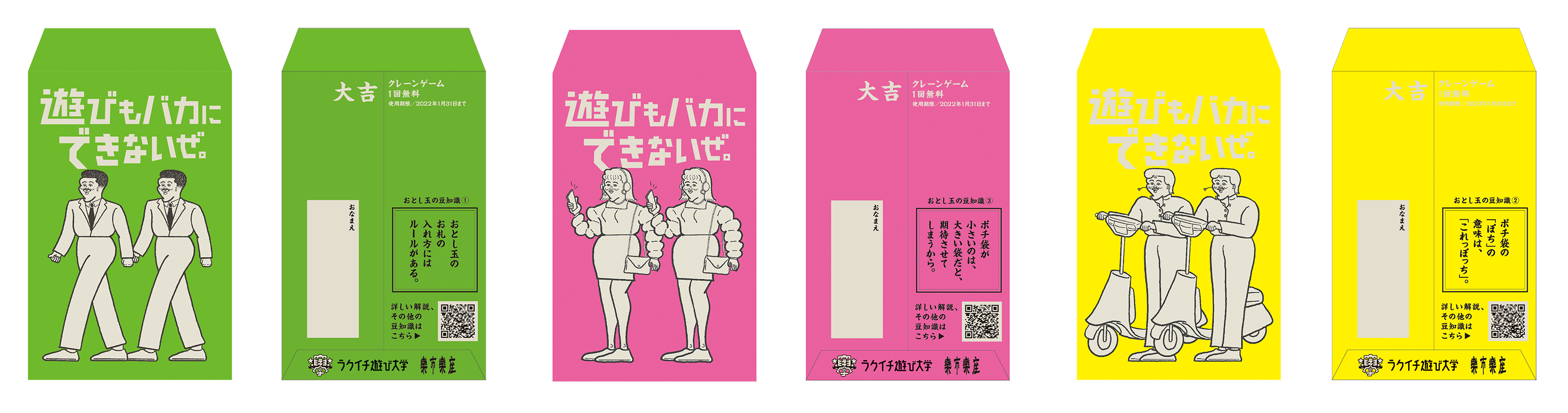 話題のイラストレーターNONCHELEEE氏が手がける楽市楽座限定の超激レア「お年玉ポチ袋」を店頭にてプレゼントいたします!なんとこのポチ袋、お年玉の豆知識とクレーンゲーム1回無料チケット付き!数に限りがございますのでお早めに店頭へお越しください。
