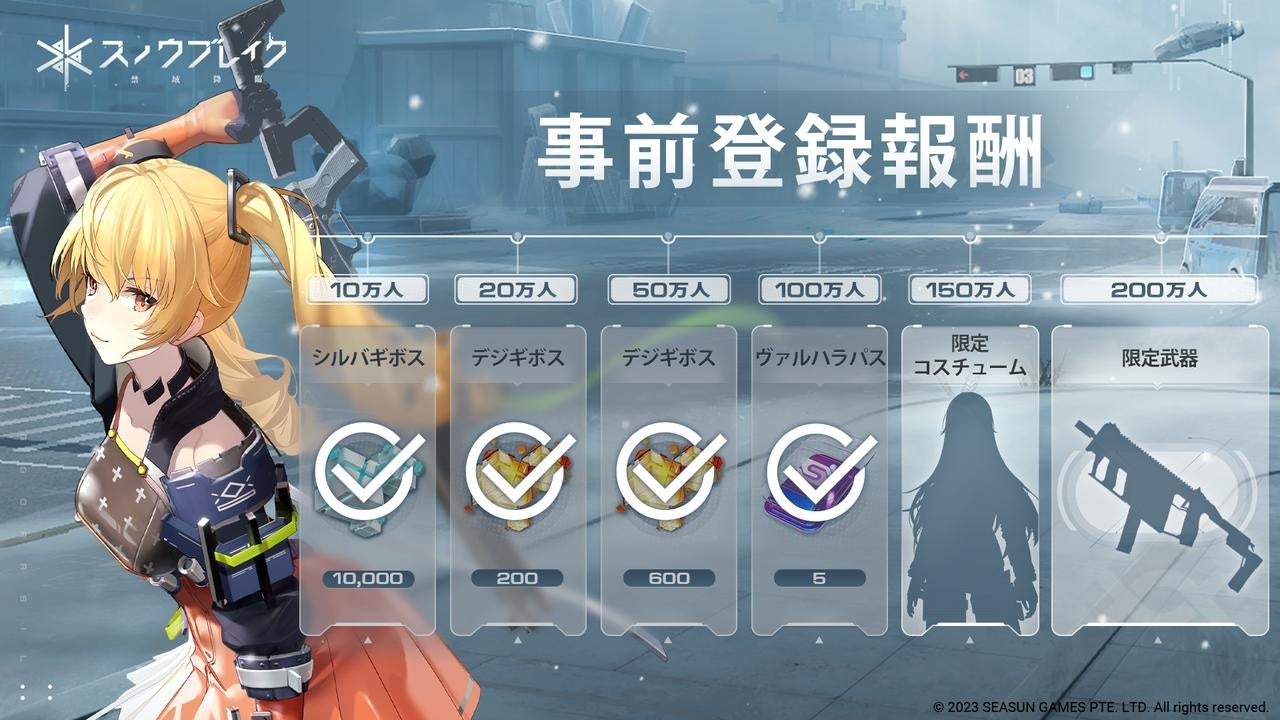 『スノウブレイク:禁域降臨』は2023年7月20日に全世界での同時配信が決定いたしましたが、それに先立って実施されていたオフィシャルサイトでの事前登録は開始9週間で100万人を達成致しました。こちらは登録者数150万人達成で「限定コスチューム」が、200万人達成で「限定武器」が全プレイヤー様にプレゼントされますので、まだ登録されてない方のご登録をお待ちしております。