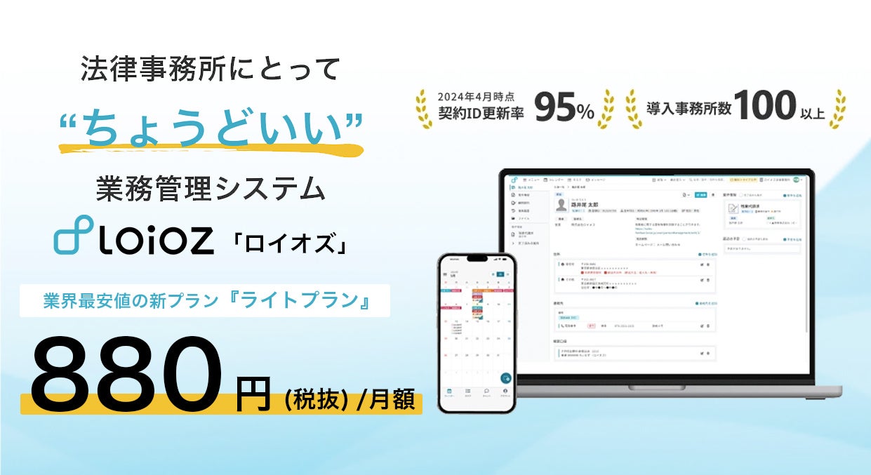 法律事務所の業務効率化に貢献するクラウドサービス「loioz (ロイオズ)」が業界最安値の月額880円(税抜)/1ユーザーの「ライトプラン」を2024年11月7日に提供開始!