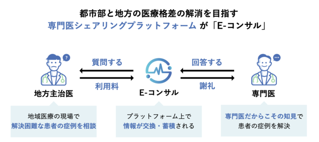 『E-コンサル®︎』は開業医や医療機関に在籍する医師が1対1で、院外や遠方の専門医にチャット機能及びビデオ通話により、コンサルを受けることが可能なプラットフォーム。従来の院内専門医コンサルと同様に自身の専門外の領域に関するアドバイスや、経験豊かな院外の医師からのセカンドオピニオンを得られる。