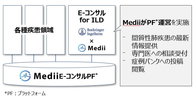 そこで今回Mediiは、間質性肺疾患領域における科学的知見を有する日本ベーリンガーインゲルハイムと提携し、膠原病に伴う間質性肺疾患をはじめ、肺線維症の患者を診察する医師向けに、同領域専門医の貴重な知見をシェアし適切な治療に繋げるための支援プロジェクトとして『E-コンサル®︎』を提供することといたしました。