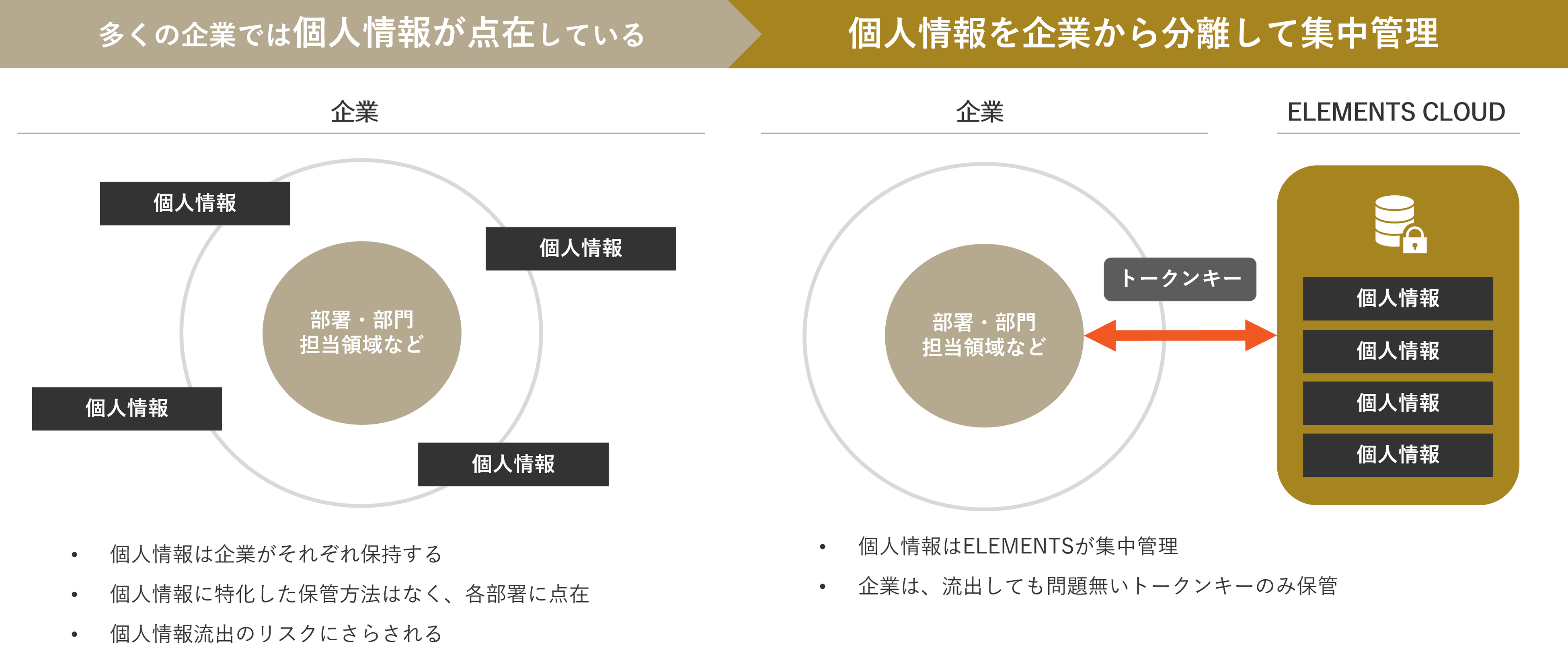 「ELEMENTS CLOUD」は、ELEMENTSが個人情報の分離管理を支援することで、導入企業の個人情報保管を不要にするサービスです。導入企業は、個人情報を「ELEMENTS CLOUD」に預けた後、個人情報を利活用するトークンキーの保持のみで、個人情報を保持する必要がなくなります。