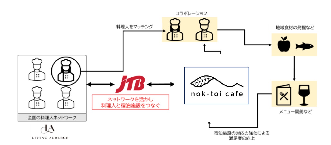 のくといカフェオープンから初となるシェフ・イン・レジデンス形態での営業は株式会社JTBとの協業により運営します。全国に有する料理人と宿泊施設のネットワークを保持し、料理人の質的・量的な不足という課題を抱える地方部の施設に対し、腕利きの料理人を派遣するJTBによる感動パーティープロデュースサービス『Living Auberge(リビングオーベルジュ)』を通じて、シェフとのマッチングが成立しました。