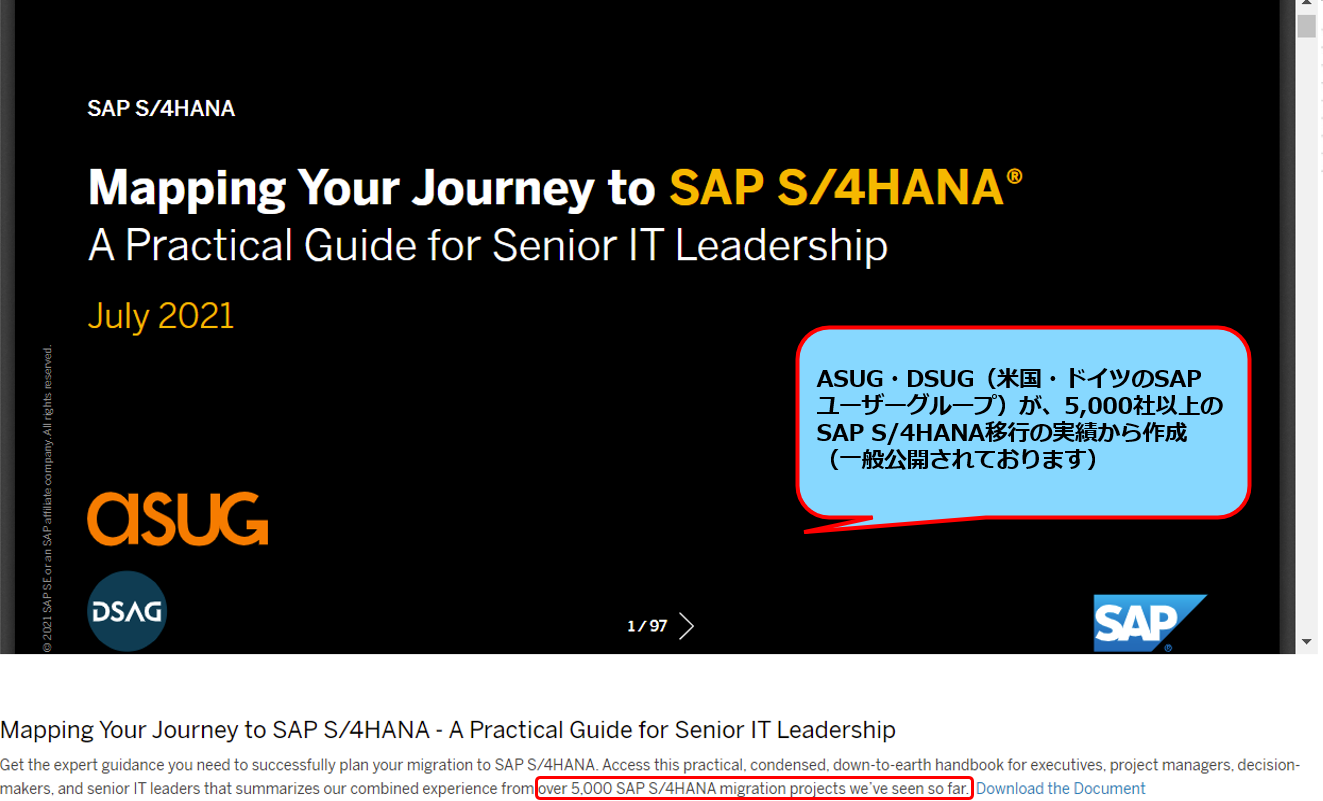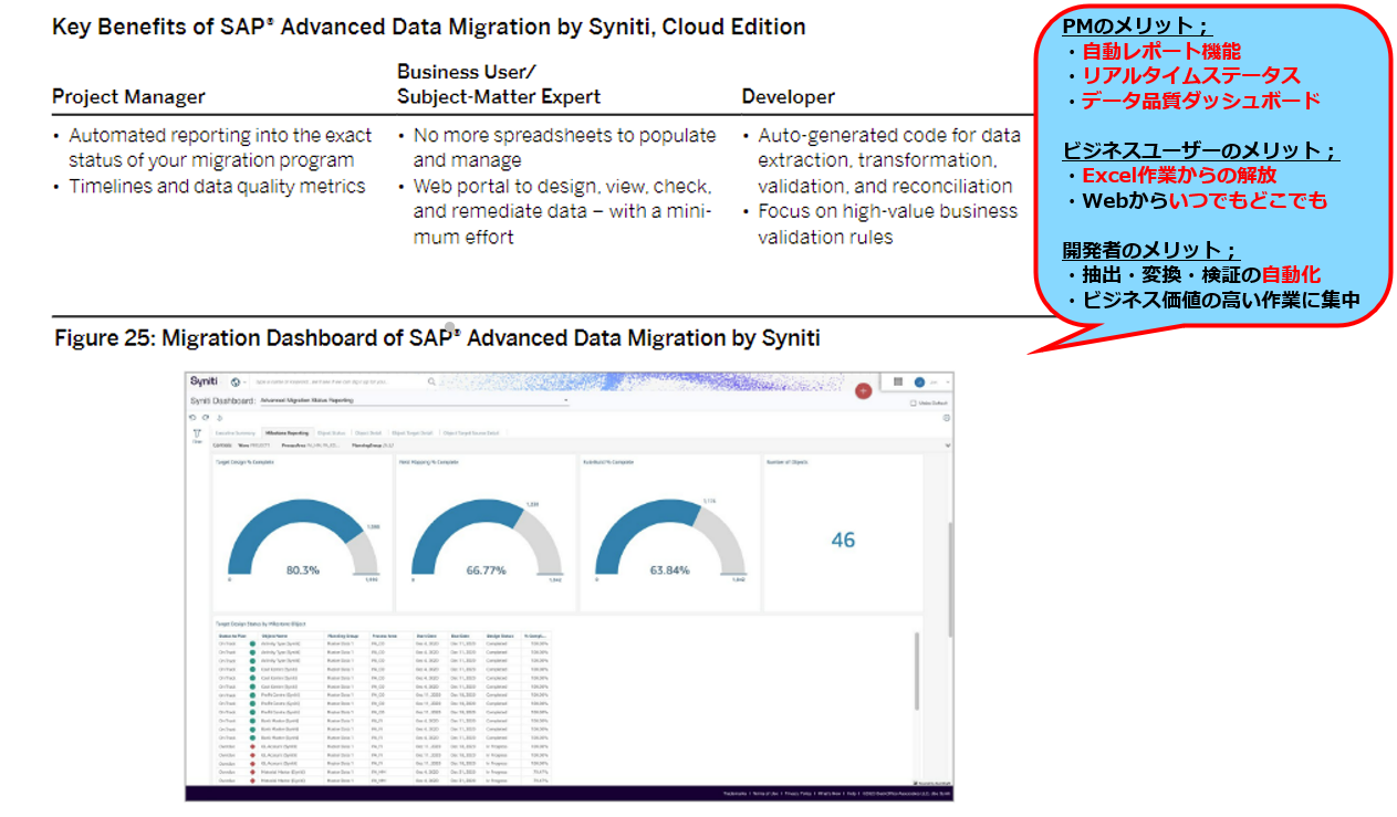 欧米のSAPユーザーグループのASUG(Americas' SAP Users' Group)およびDSAG(Deutschsprachige SAP-Anwendergruppe)が公開しているドキュメント(A Practical Guide for Senior IT Leadership)では、レガシーからの新規、SAP® ERPからグリーンフィールドや、複数データソース統合、データガバナンス向上、大規模ロールアウトプロジェクトなど、難易度の高いSAP S/4HANAデータ移行でSynitiが推奨されています。