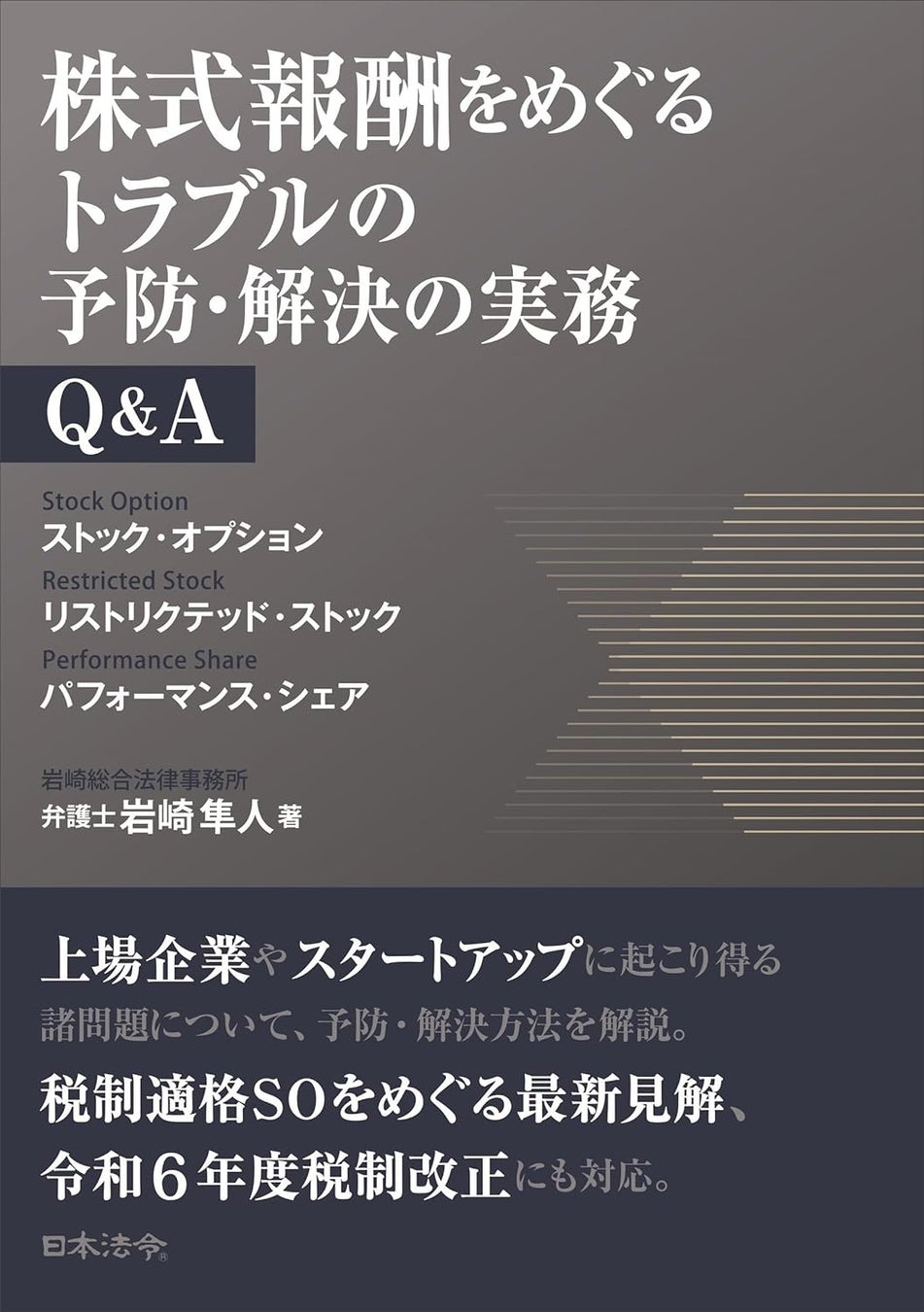 岩崎総合法律事務所(東京都千代田区。以下「弊事務所」)の代表弁護士・岩崎隼人による単著『株式報酬をめぐるトラブルの予防・解決の実務Q&A』(以下「本書」)が、2024年5月、株式会社日本法令より出版されましたのでお知らせいたします。