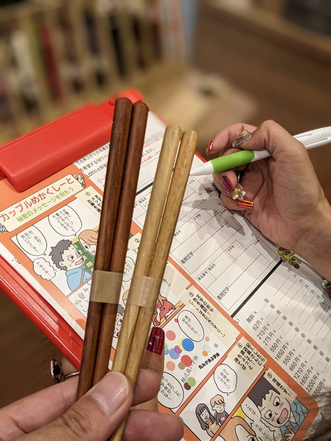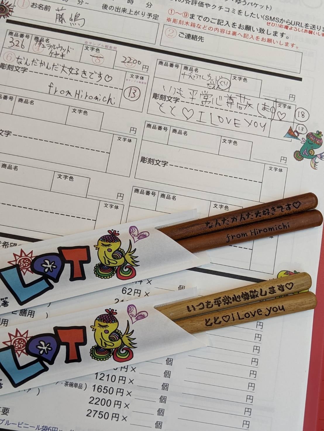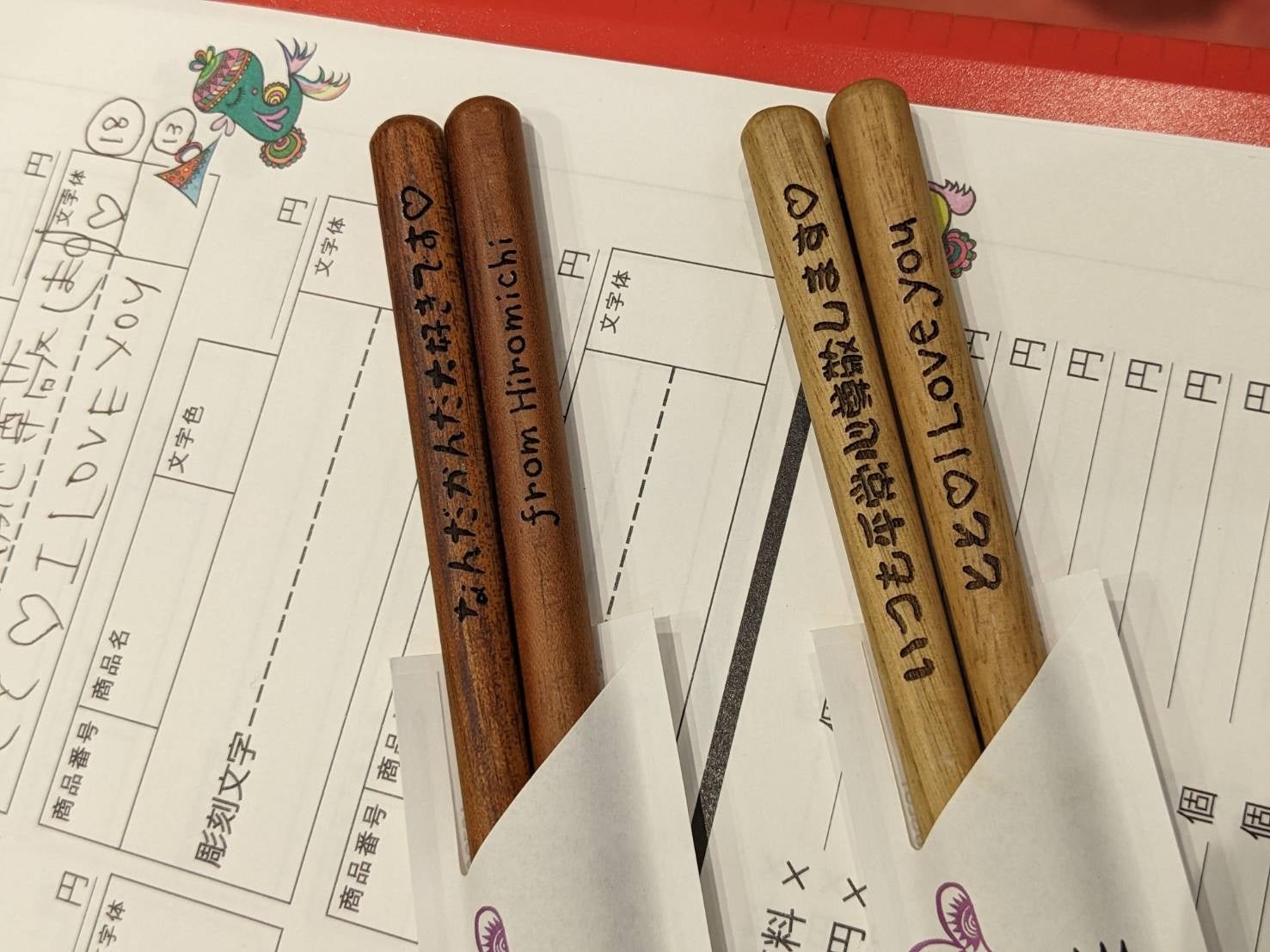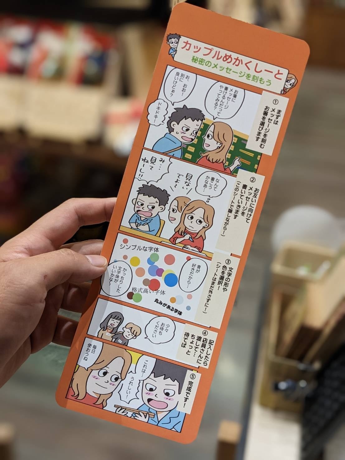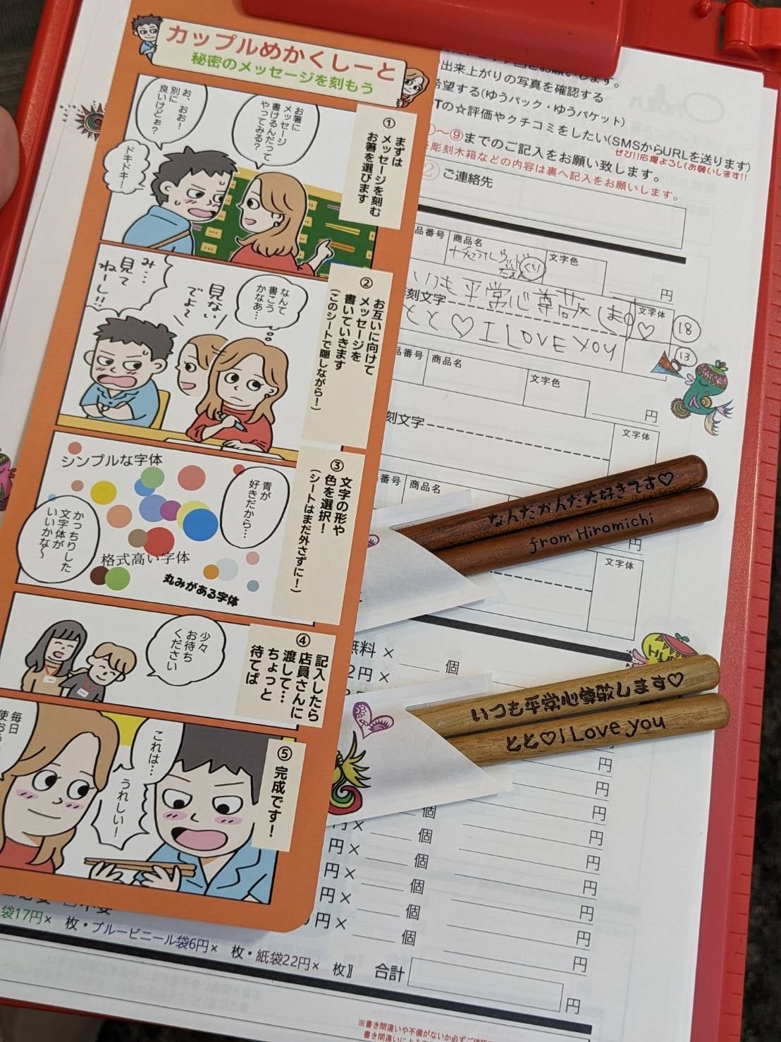 「カップルめかくしーと」は、ゲーム感覚でお互いにメッセージを隠しながらお箸に刻むというユニークなサービスです。二人が選んだお箸に、それぞれが秘密のメッセージを刻み合い、仕上がった刻印を「せーの」で披露する瞬間は、笑いと感動が待っています。日常では照れくさくて言えない気持ちを、遊び心たっぷりに伝えることができるこの体験は、二人の絆をより一層深めます。