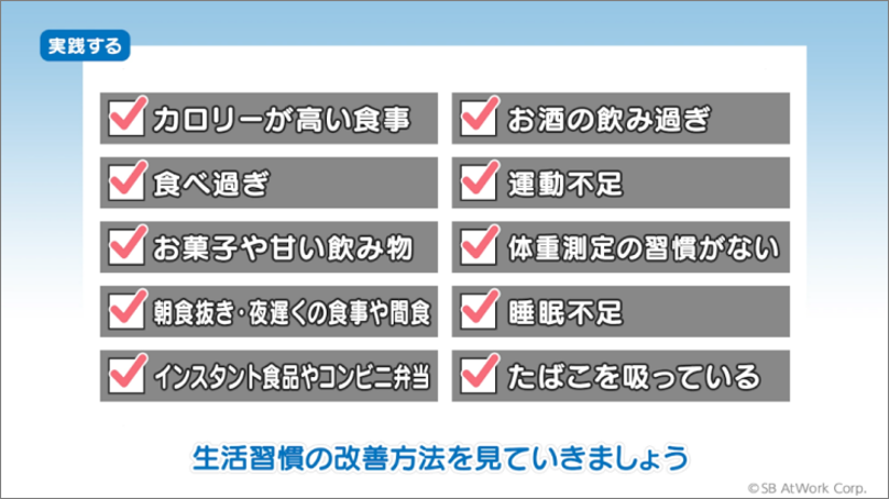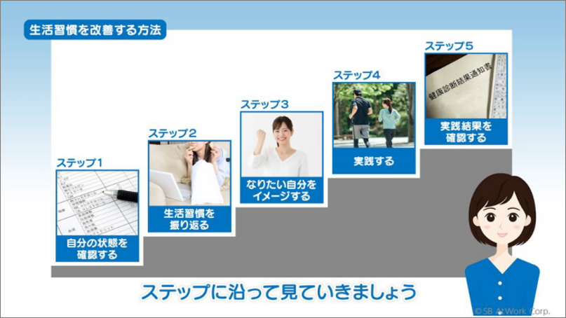 「~正しく理解し実践しよう~生活習慣病を防ぐ良い習慣」は、2021年10月に提供開始した「生活習慣病~正しく理解し予防しよう~」の実践編として、生活習慣病を予防するためのより具体的な方法について学ぶことができるコンテンツです。不健康な生活習慣を続けることで進行する健康リスクを理解し、「何から始めたらよいのか分からない」と感じる人のために、生活習慣を改善するための方法を5つのステップに分け、改善に向けた行動を継続するためのポイントについても解説しています。