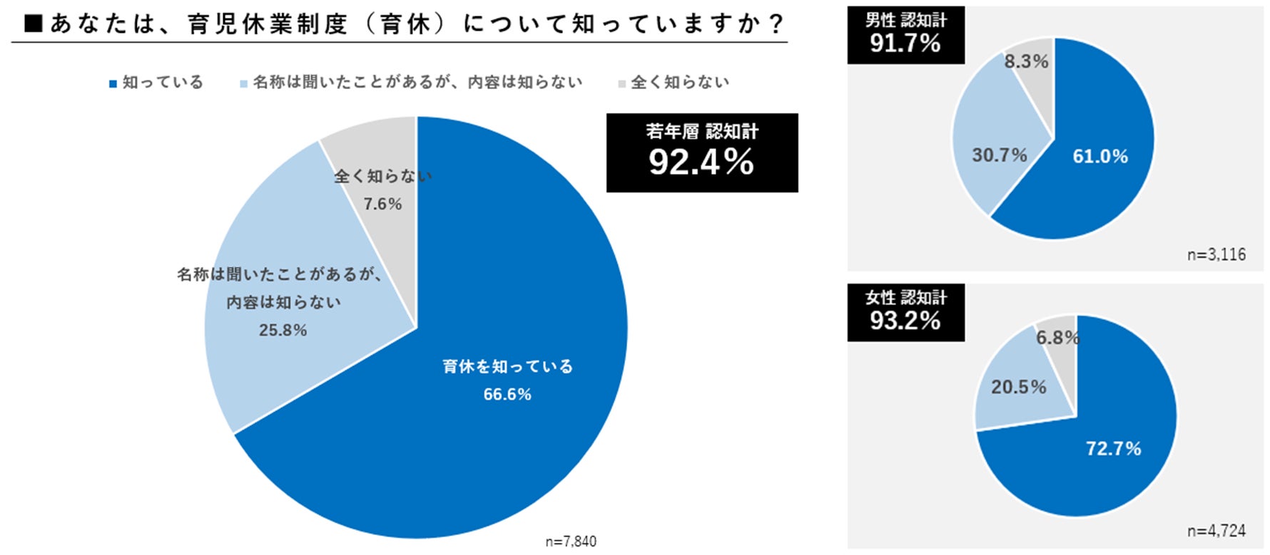 「育児休業制度」の認知度について、若年層の92.4%が「知っている」と回答しています。男女別でも90%以上が知っていると回答し、非常に高い結果となりました。「育児休業制度」の認知度を他の制度と比較した場合においても、若年層の90%以上が「育児休業制度」を認知しており、認知度が最も高い「年次有給休暇」(92.8%が知っていると回答)との差も僅か0.4ptでした。