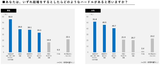 男女別でみると、男女ともにトップは「お金の問題」(男女とも56.7%)でした。男性は「お金の問題」に次いで、「結婚相手の働き方」(36.4%)、「住居の問題」(35.1%)であるのに対し、女性は「自分の働き方」(39.7%)、「結婚相手の働き方」(35.8%)という結果となり、男女でハードルと感じる問題に差があることがわかりました。