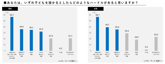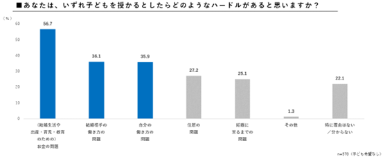 調査時点で子どもを授かることについての意向がない若年層に対し、子育てのハードルについて質問したところ、「お金の問題」が56.7%と最も高く、次に「結婚相手の働き方の問題」(36.1%)、「自分の働き方の問題」(35.9%)と、ライフイベントの共通課題が明らかとなりました。