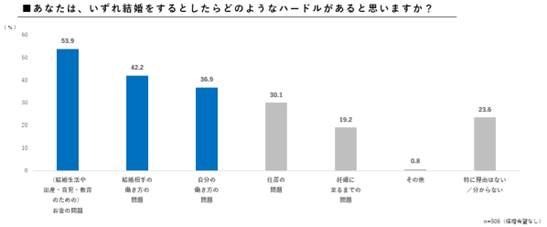結婚、子育てのハードルは、男女ともにお金の問題」が最も高く、次いで「(自分や相手の)働き方の問題」という回答結果に。2位以降の回答に男女差が。