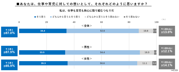 また、「仕事も育児も熱心に取り組む」意向については、87.0%が「そう思う」と回答しています。男女別では、男性87.9%、女性85.9%と、「仕事も育児も熱心に取り組む」意向に、男女差はみられない結果となりました。