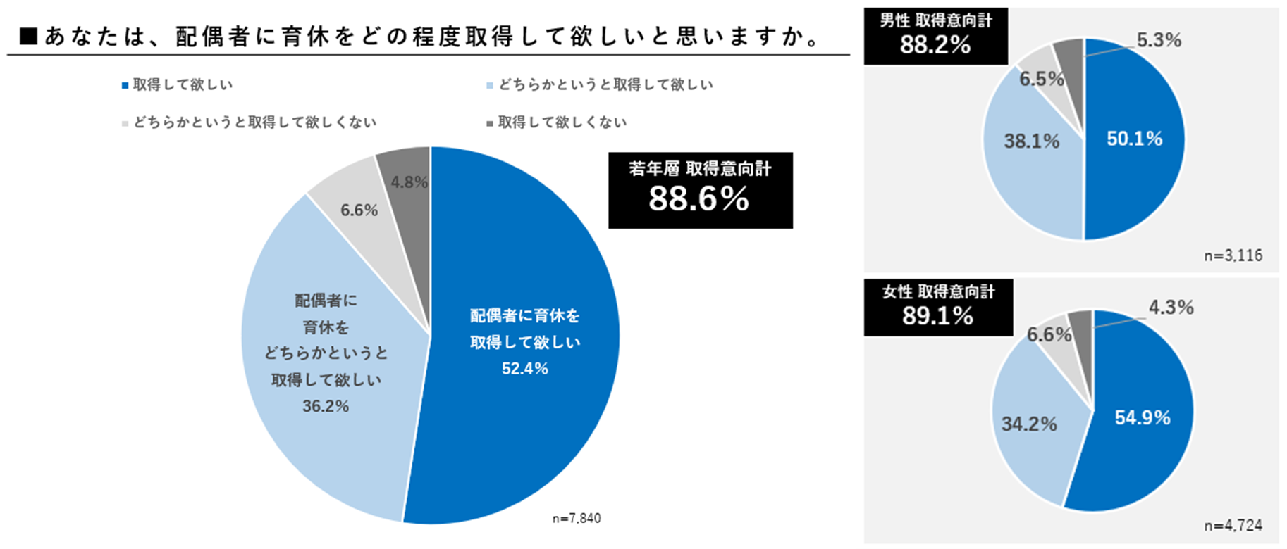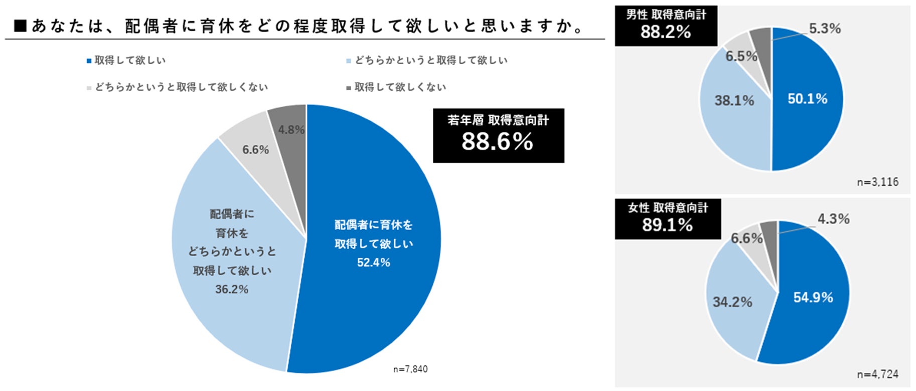 「配偶者に育休を取得してもらいたいか」の意向を尋ねると、88.6%が「配偶者に育休を取得してほしい」と回答しており、男女問わず、若年層の育休取得への意向の強さが明らかになりました。