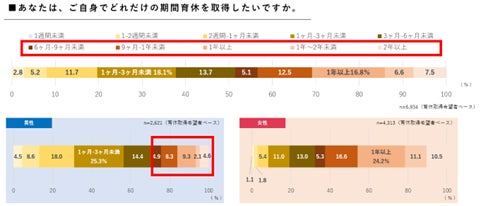 さらに、育休を取得するに当たって希望する期間を聞いたところ、男性の約3割が「半年以上」を希望し、1年以上を希望する男性も16.0%と、長期間の育休取得の希望が高い結果となりました。