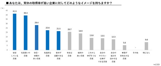 また、育休取得率が高い企業に対しては、「安定している」(41.5%)、「社員想い」(39.3%)、「先進的」(22.6%)、「若手が活躍できる」(21.5%)などポジティブなイメージを抱いていることが明らかになりました。