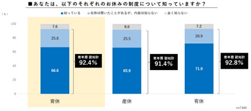 若年層の育児休業制度の認知度は、「(制度があることを)知っている」が92.4%、「取得意向がある」が87.7%と、ともに9割近い結果に。 また、88.6%の若年層が、 配偶者に育児休業を取得してもらいたいと考えており、自分の取得意向の高さも合わせて若年層の育休取得への関心の高さが明らかに。
