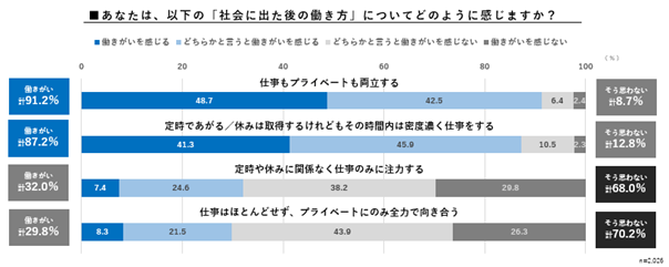 「社会に出た後の働き方」について、何に働きがいを感じるか」の問いに対しては、「仕事もプライベートも両立する」(91.2%)、「定時であがる/休みは取得するけれどもその時間内は密度濃く仕事をする」(87.2%)の順に多く、仕事もプライベートも両方大事にしたいと思っていることがうかがえます。