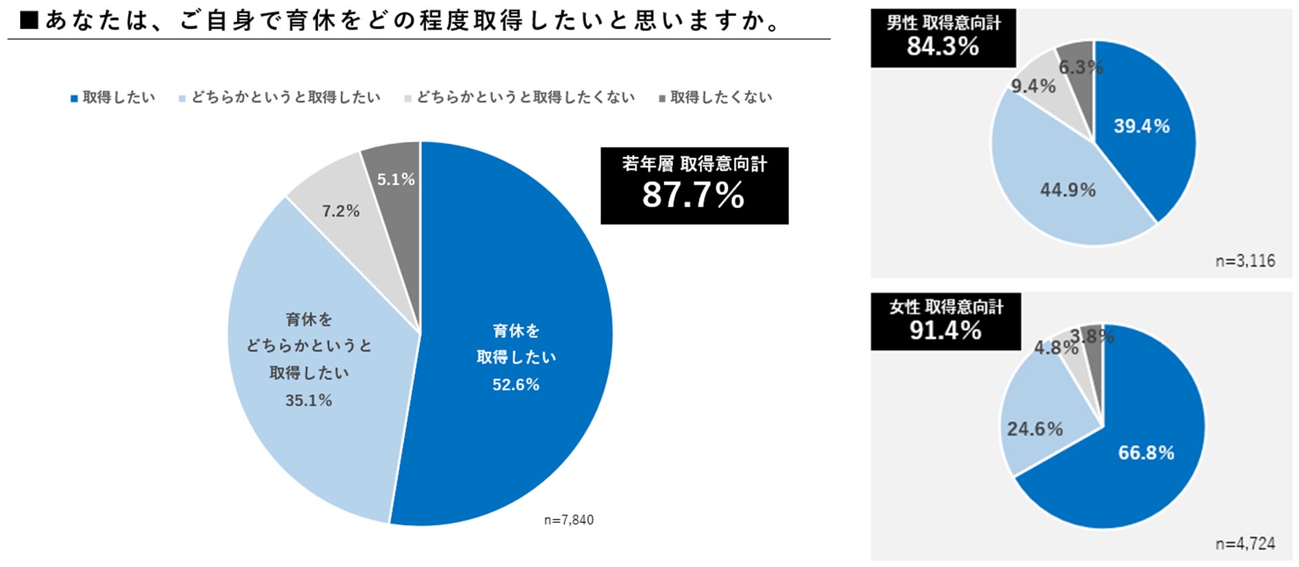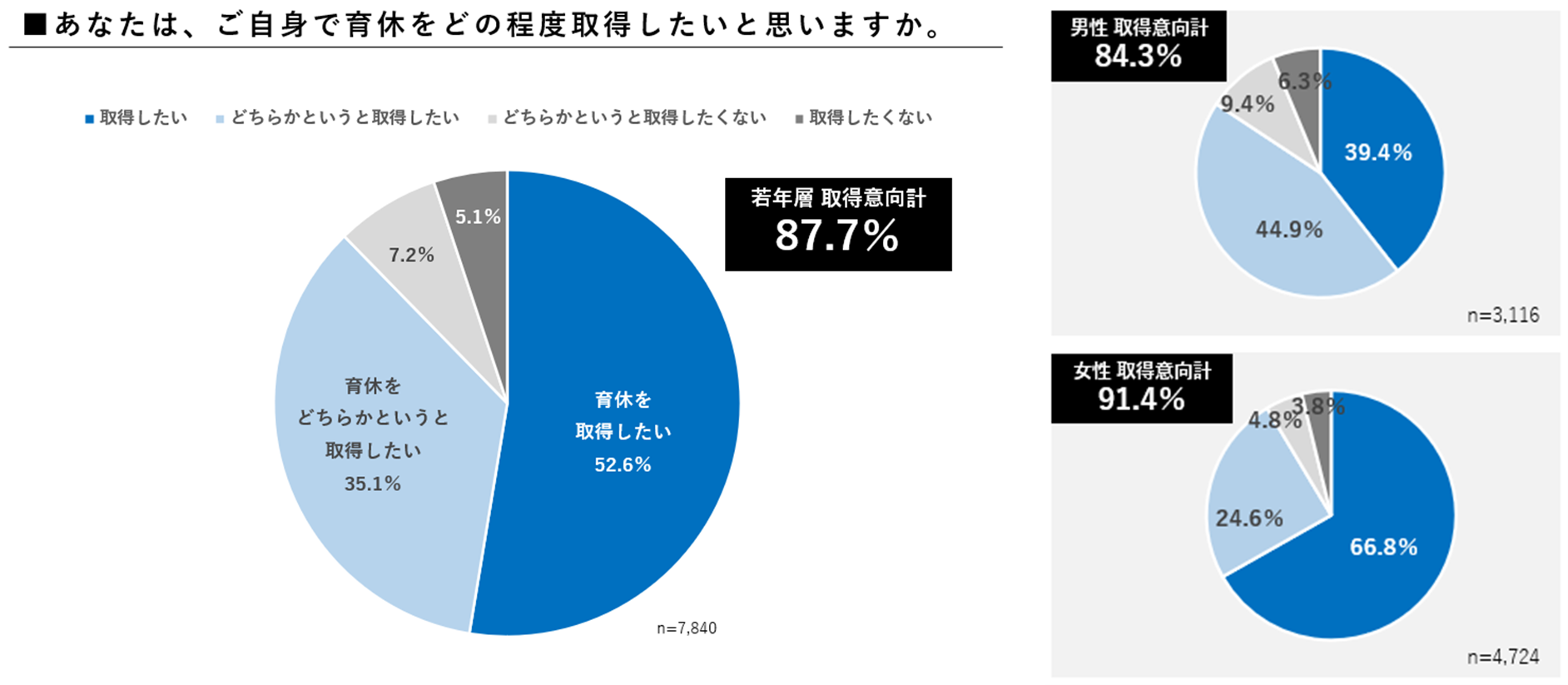 また、若年層に「自分自身は育休を取得したいか」と尋ねたところ、「取得したい」が87.7%と9割近い結果になりました。男女別では、女性91.4%、男性84.3%と、多少の男女差はあるものの、男女ともに9割程度の若年層が、育休取得意向がある結果となりました。