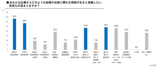 就職活動において、「どのような結婚や出産に関わる情報があると就職意向が高まるか」聞いたところ、「男性の育休取得状況」が33.4%と最も高く、育休取得の情報が、若年層の企業選びにおいて重要視されていることが明らかになりました。