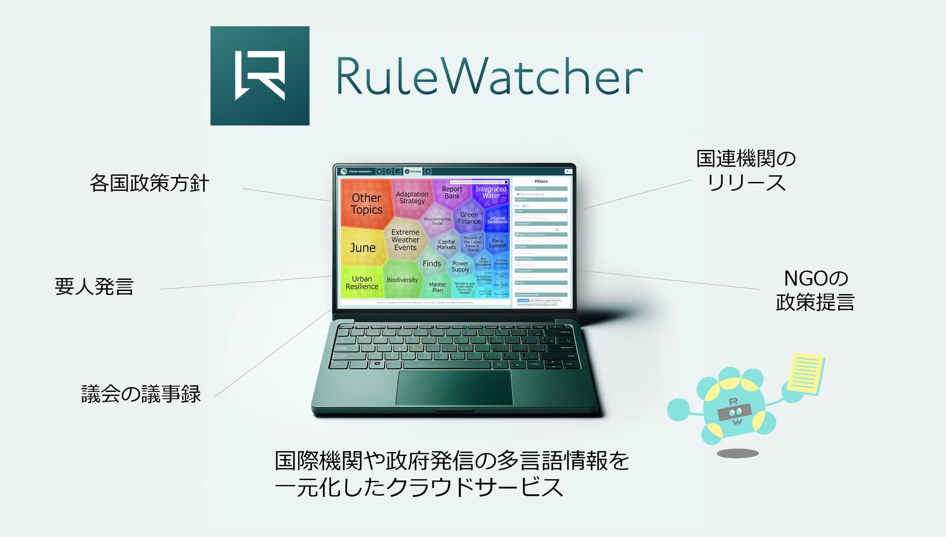 環境や人権に関する、各国政府・国連関係機関・NGO等の発信情報を言語統一して一元的に閲覧できるウェブツールです(国際特許出願中)。ユネスコ人工知能研究機関IRCAIよりGlobal Top100ソリューションとして認定されています。
