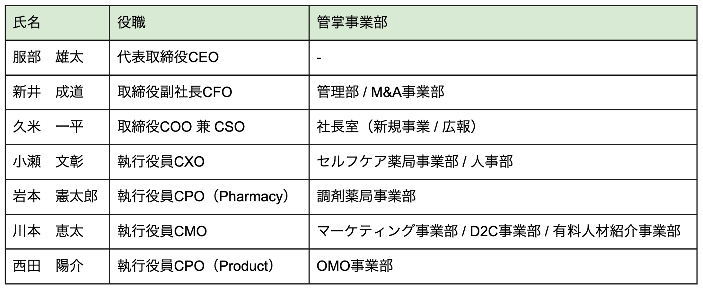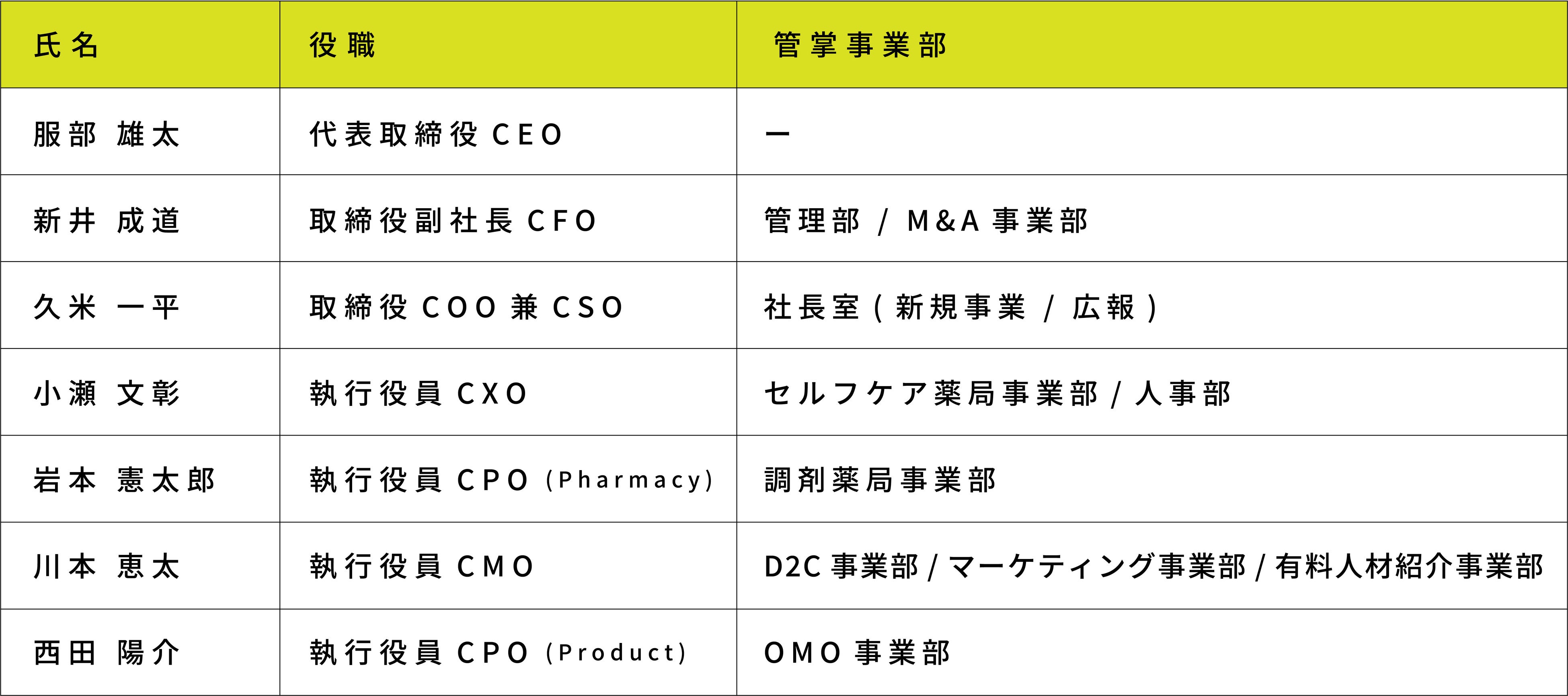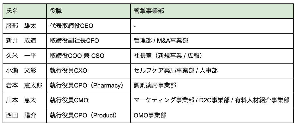 今後、各事業の伸長と、各事業の統合によるセルフメディケーション構想の実現が必要になります。そのため、事業を横断で見る立場を取締役、また事業を縦軸で伸長させる役割を執行役員とし、2022年5月より博報堂出身の執行役員COO 兼 CSOである久米 一平が新たに取締役に就任し、全体の事業統合と体験構築を担ってまいります。