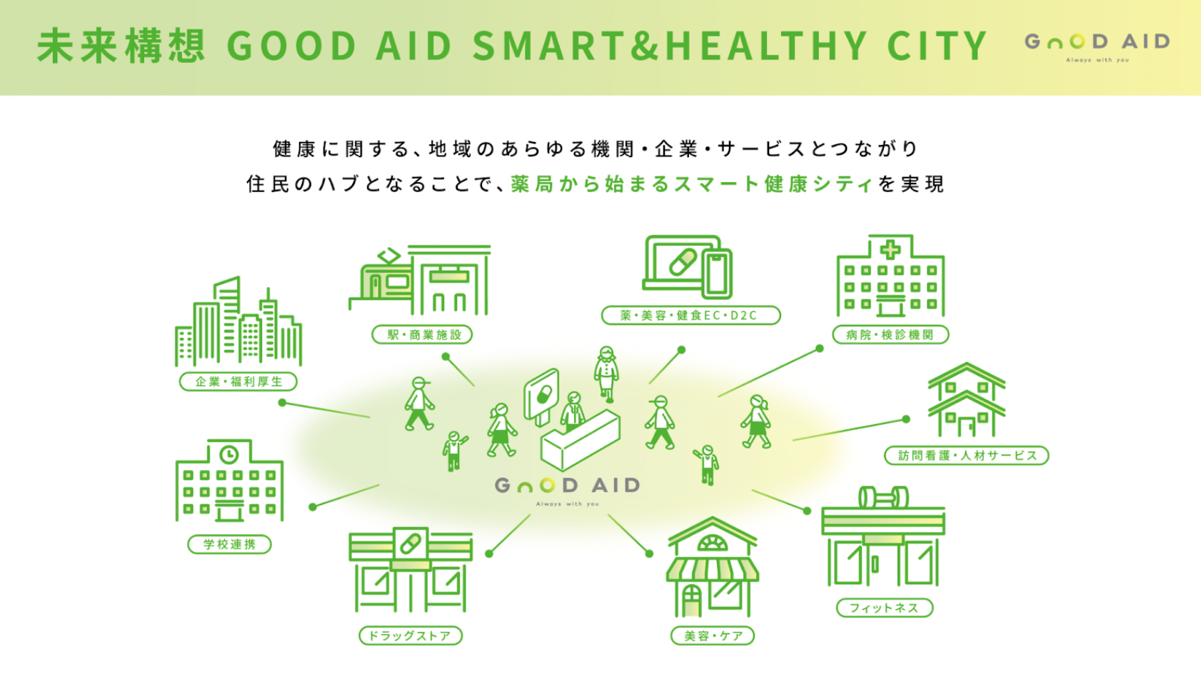 さらに先の世界としては、GOOD AIDは調剤薬局・零売薬局事業の他にも「訪問看護」「D2C商材」「有料人材紹介」「M&A」など複数の事業を展開しており、企業ビジョンにも据えている【Well-being】を実現するため、従来の薬局の在り方に止まらず、未病・予防など様々な領域の相談ができる「街の保健室」を目指してまいります。