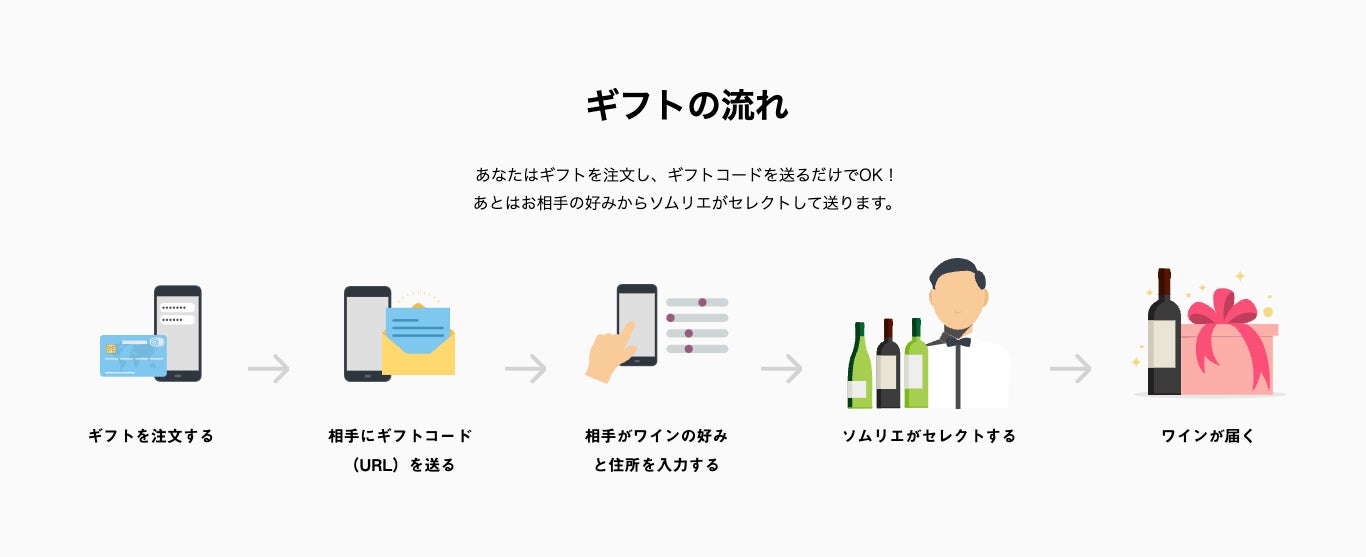 「知り合いにワインをプレゼントしたいが、自分ではうまく選べない」「ワインをソムリエに選んでもらうという体験も含めてプレゼントしたい」という方にご利用いただきたい機能となっております。