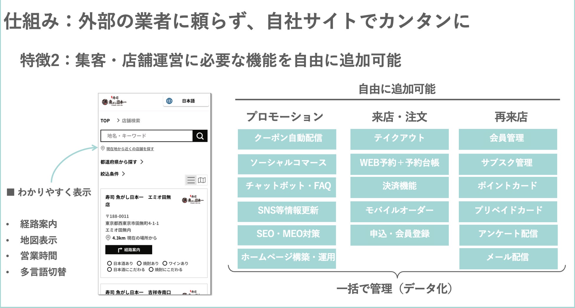 店舗ページのMEO・SEO対策だけでなく、予約・申込からテイクアウトなど売上につなげる仕組み化と、会員登録からポイント付与、クーポン配信などの再来店の仕組み化を同時に実現できます。