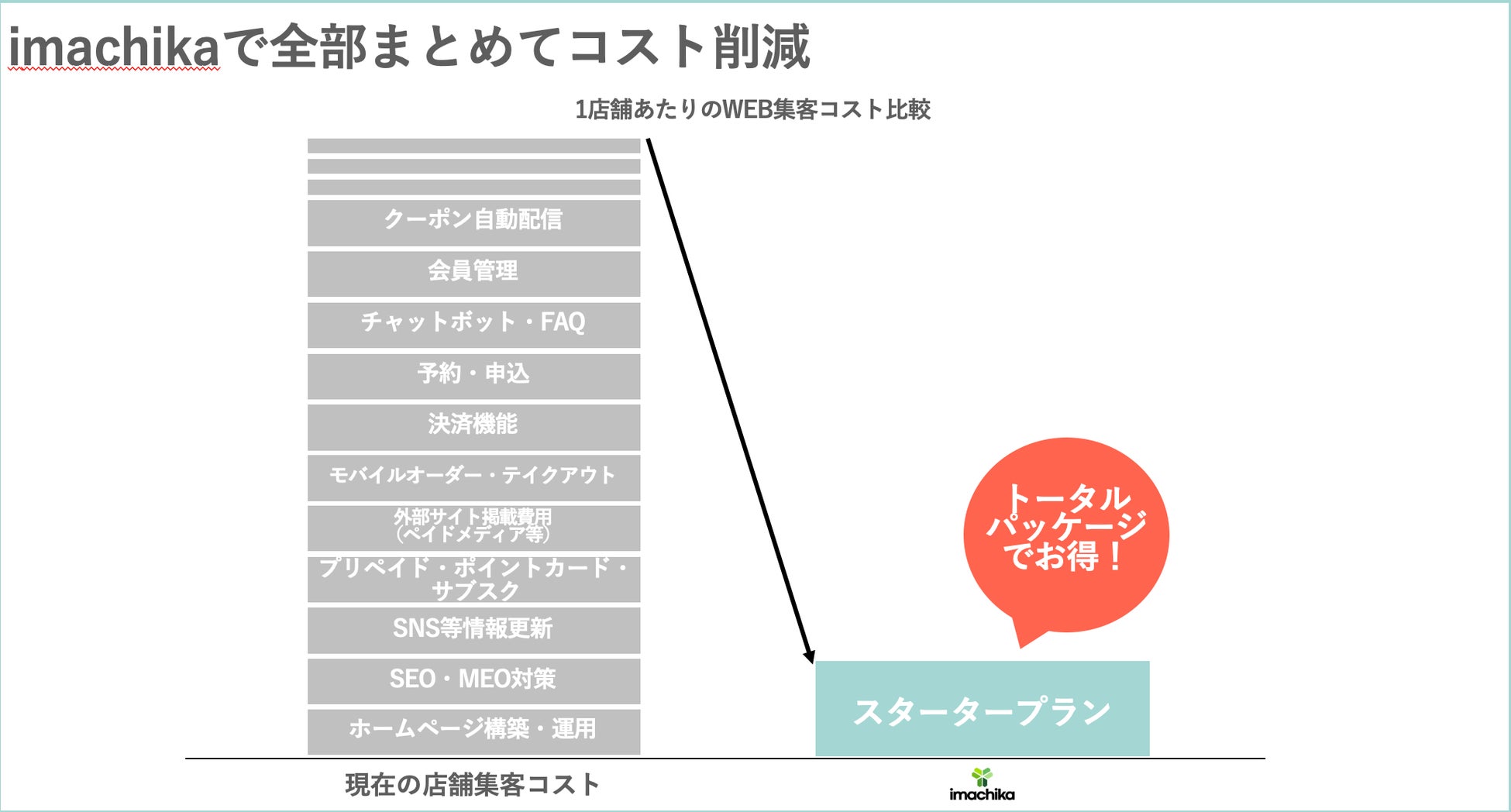 複数の外部サービスを利用していた場合、imachikaをご利用いただくとトータルコストを削減でき、データ活用の観点でもお客様でしっかり管理いただけます。
