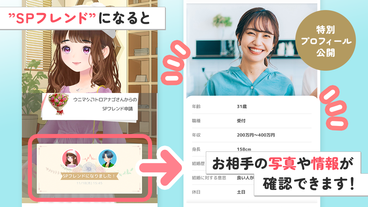 「SPフレンド」になってようやくお互いの顔写真や年齢等、パーソナルな部分である特別なプロフィールの確認ができるようになります。