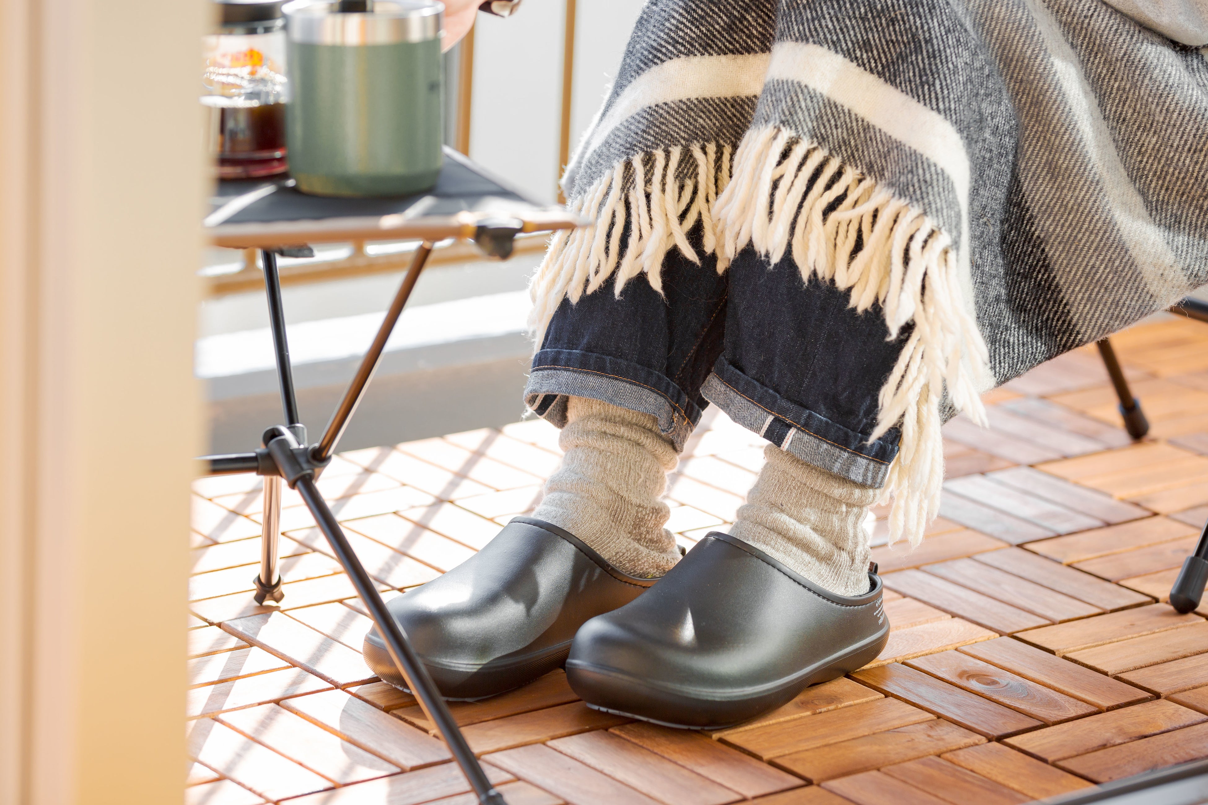 アッパーやソールに穴が一切ないので、雨や汚れに強いのが特徴です。歩きやすさも考慮し、ポイントはボアの下に内蔵したスポンジ。軽量で弾力性があるEVA素材を使用しているうえに、ボアの下に内蔵したスポンジによって弾力性が増し驚くほどフィットします。さらに少し上向きになったつま先によってつまずきにくく、幅広設計なので安定性も抜群。長時間の歩行や立ち仕事でも疲れにくくなっています。ソールは凹凸のあるラバー底。グリップ力を高めて、歩行をサポートします。