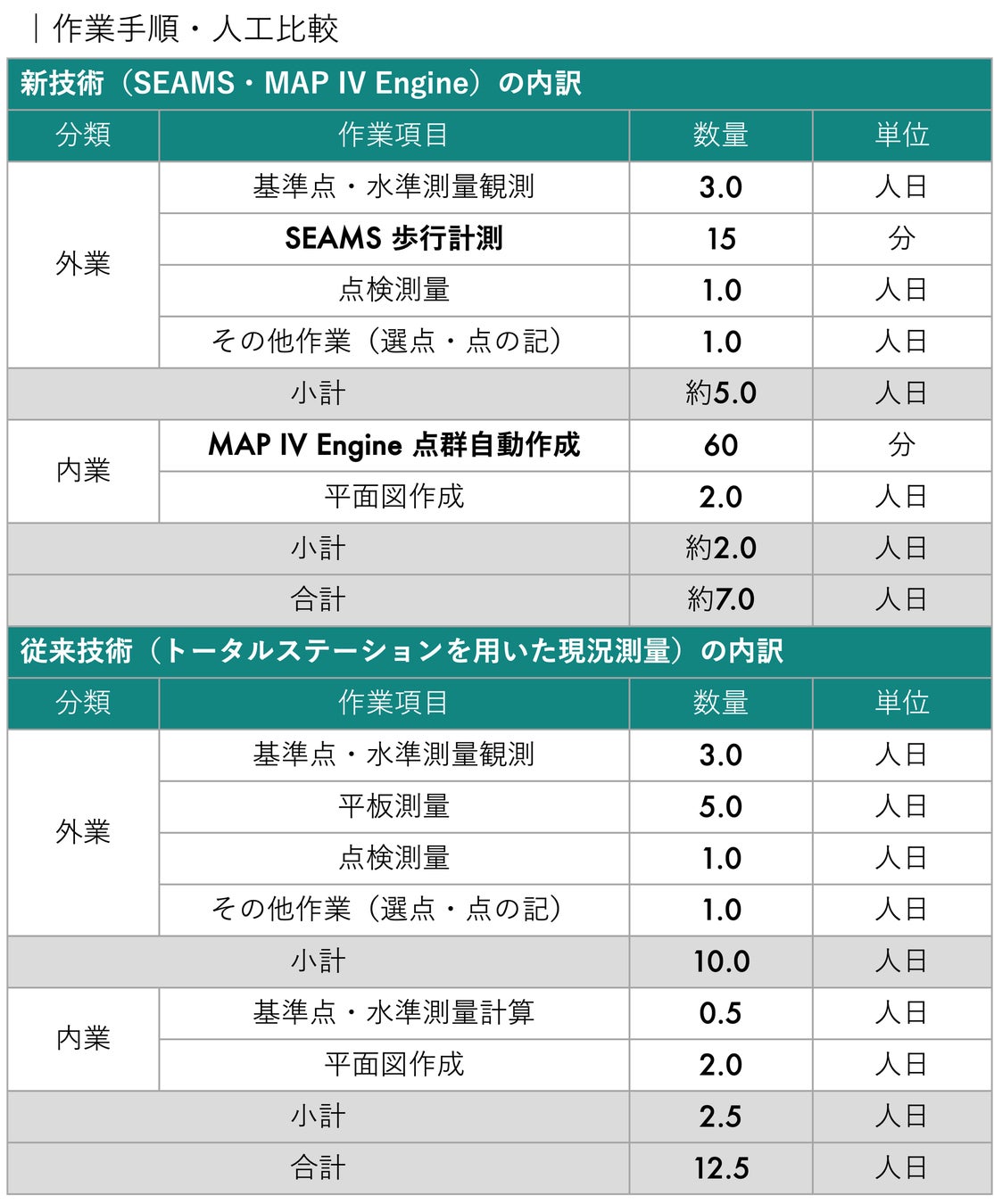 TSを用いた測量で12.5人日かかっていた作業は、SEAMS+MAP IV Engineを使用することにより約7人日で完了させることができます。作業時間を大幅に短縮し、人件費を抑えることができます。