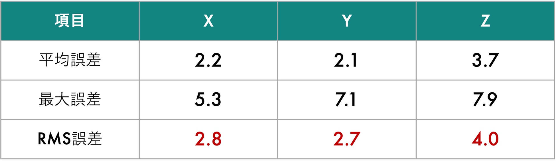 XYZいずれの成分においても、マニュアルで規定されている要求精度誤差±5cm以内の結果を示すことができました。