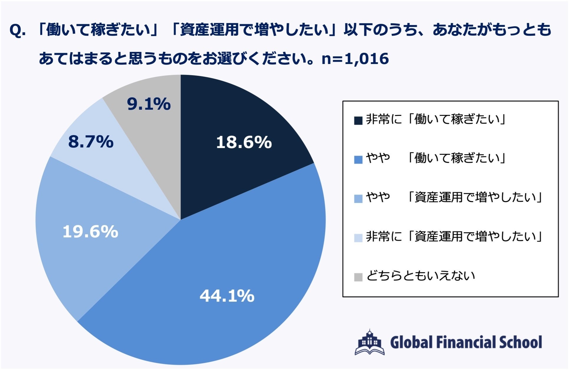 自身の志向について、「貯金・定期預金派」と「資産運用派」、また「働いて稼ぎたい」と「資産運用で増やしたい」との比較で質問したところ、「資産運用」の志向よりも「貯金・定期預金」「働いて稼ぎたい」志向のほうが強く、考え方としては半数以上が”働いて貯める“手堅い考え方であることがわかりました。