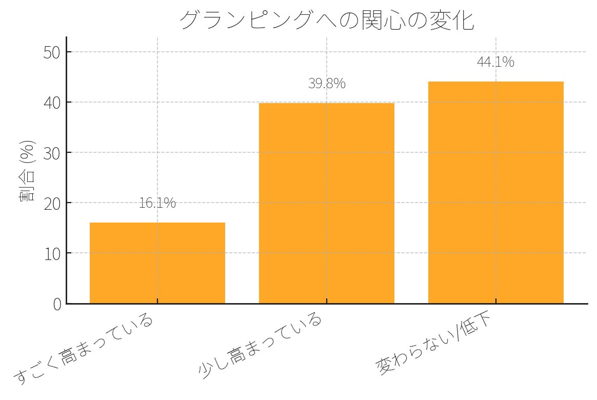 「グランピングへの関心の高まり」についても、「すごく高まっている」(16.1%)と「少し高まっている」(39.8%)を合わせると55.9%となっています。