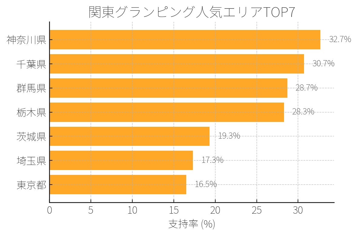関東在住者に「関東地方でグランピングに行きたい都県」を尋ねたところ、「神奈川県」が32.7%でトップとなりました。続いて「千葉県」(30.7%)、「群馬県」(28.7%)と僅差で続き、「栃木県」(28.3%)、「茨城県」(19.3%)、「埼玉県」(17.3%)、「東京都」(16.5%)の順でした。