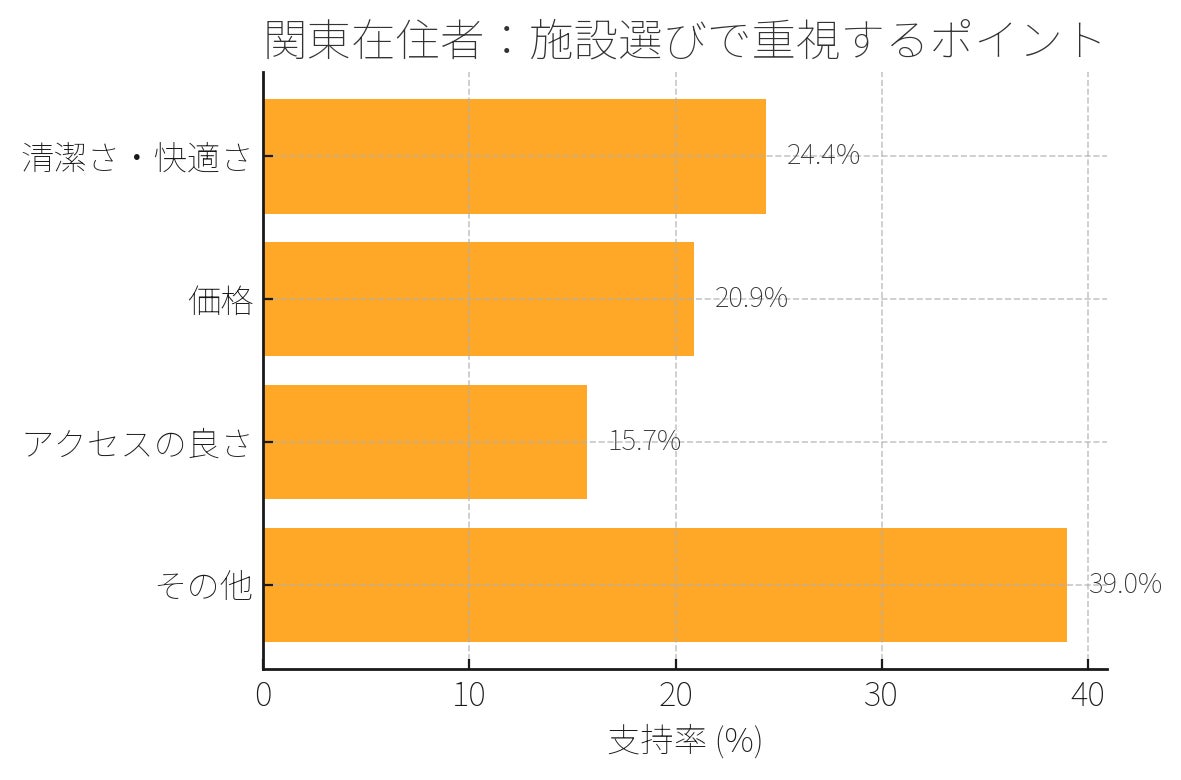 また、「アクセスの良さ」の重視度が高いのは、渋滞や交通手段の制約を強く意識する都市部住民ならではの特徴です。実際に、多くの関東在住者は「都心から2時間以内でアクセスできる」ことを施設選びの重要な判断材料としているようです。