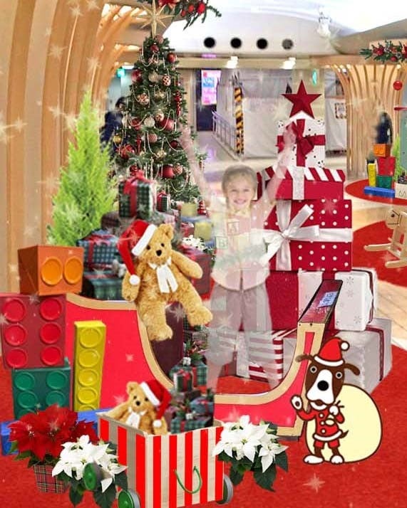 おもちゃに囲まれたサンタクロースのソリに乗って写真が撮れるフォトスポットなど