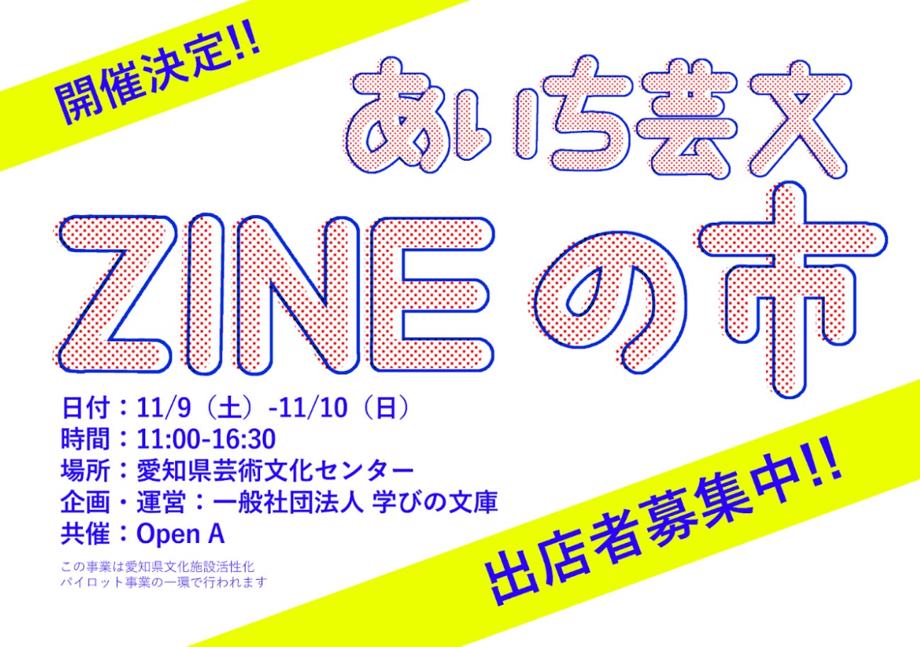 愛知県近隣のZINEクリエイターやZINEに興味がある方が一堂に会する『あいち芸文ZINEの市』を初開催いたします。本イベントは、ZINEやアートに興味がある人、新しいカルチャーに触れたい人、自分だけのオリジナルZINEを作りたい人など様々な人の発信の場所であり、コミュニケーション創出の場所となります。開催に伴い出展者受付を開始いたします。出店申込みの詳細は下記の詳細情報よりご確認ください。
