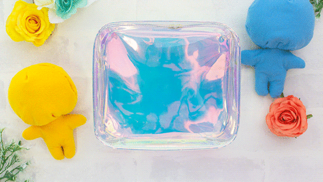 - 正面は中身が見えやすいクリア素材、その他の部位は角度で七色に変わるオーロラPVC素材