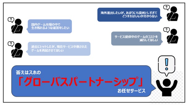 ゲーム開発、グラフィック外注などの「コンテンツ開発」、ターゲットに合わせた宣伝方法の提案「マーケティング」、市場調査、競合分析、リスク管理などの「運営・CS」、海外展開に欠かせない現地の文化、言語、法規制などの反映「カルチャライズ」等のサービスを用意しており、実績のあるプロの技術を利用することで、新市場において早期に結果を出すことに貢献できるサービスとなっております。準備からサービス開始まで最長3ヶ月いただき、サービス開始後は運営及びマーケティングをご支援いたします。