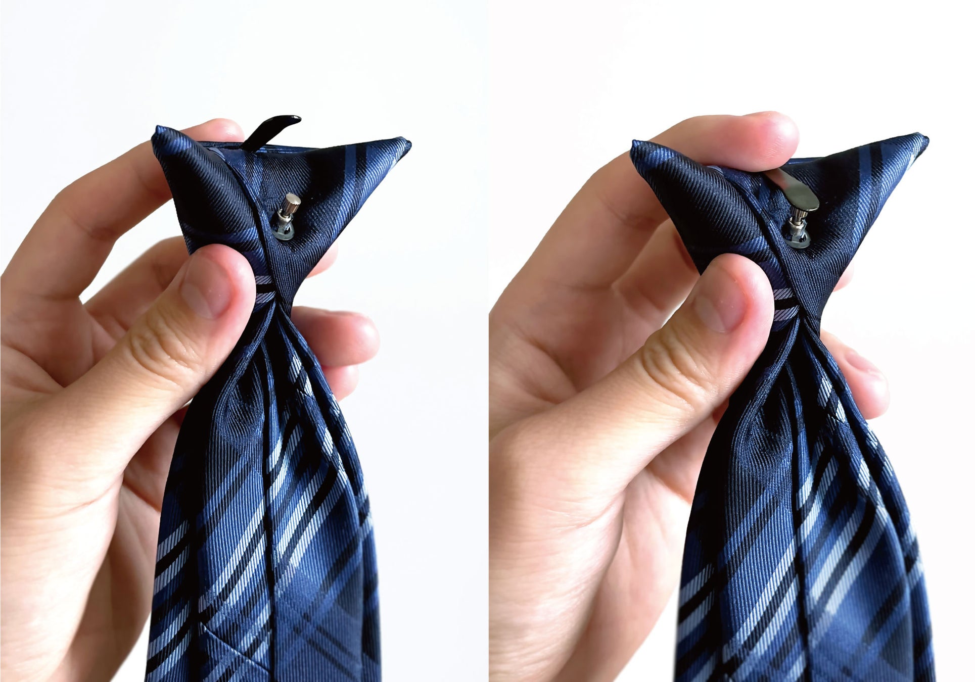 NOTKNOTスナップタイの結び目はスナップパーツに生地を固定しているので結び目が緩む事はなく、いつまでも綺麗な形をキープできます。見た目も普通のネクタイを結んでいるのと同じ感覚でドレスアップできます。