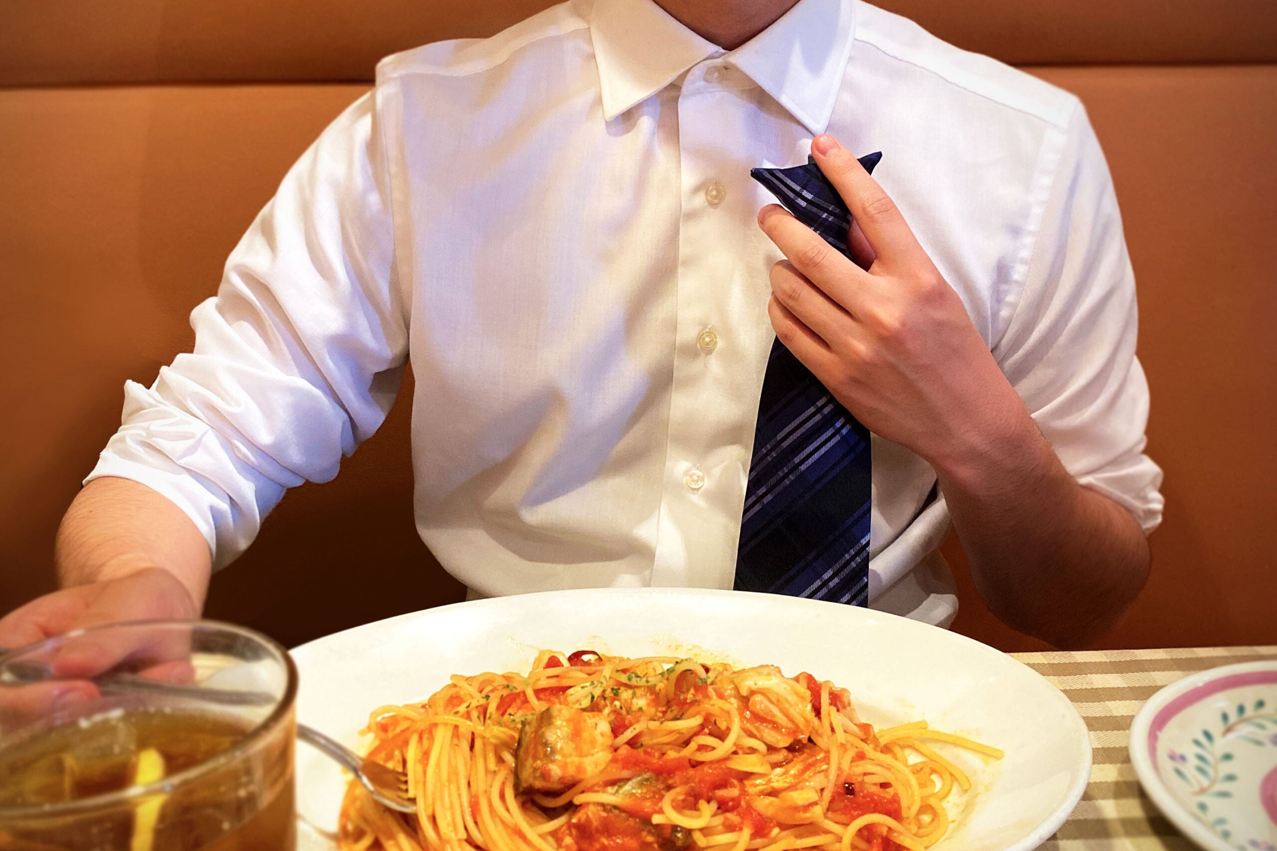 ソースなどが飛びやすい食事の時。ついついネクタイを結びなおすのが面倒でそのまま食べてたら、あっ・・!