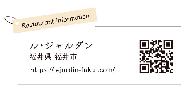 福井という土地の食材が持つ力強さや風味を最大限に引き出すことを追求しています。 一皿に込めるのは、旬の味わいやその土地ならではの個性。料理を通して福井の魅力を 伝えることが、自分の使命だと感じています。地元の生産者と密に連携し、食文化を 次世代へとつなぐ一助となれるよう努めています。