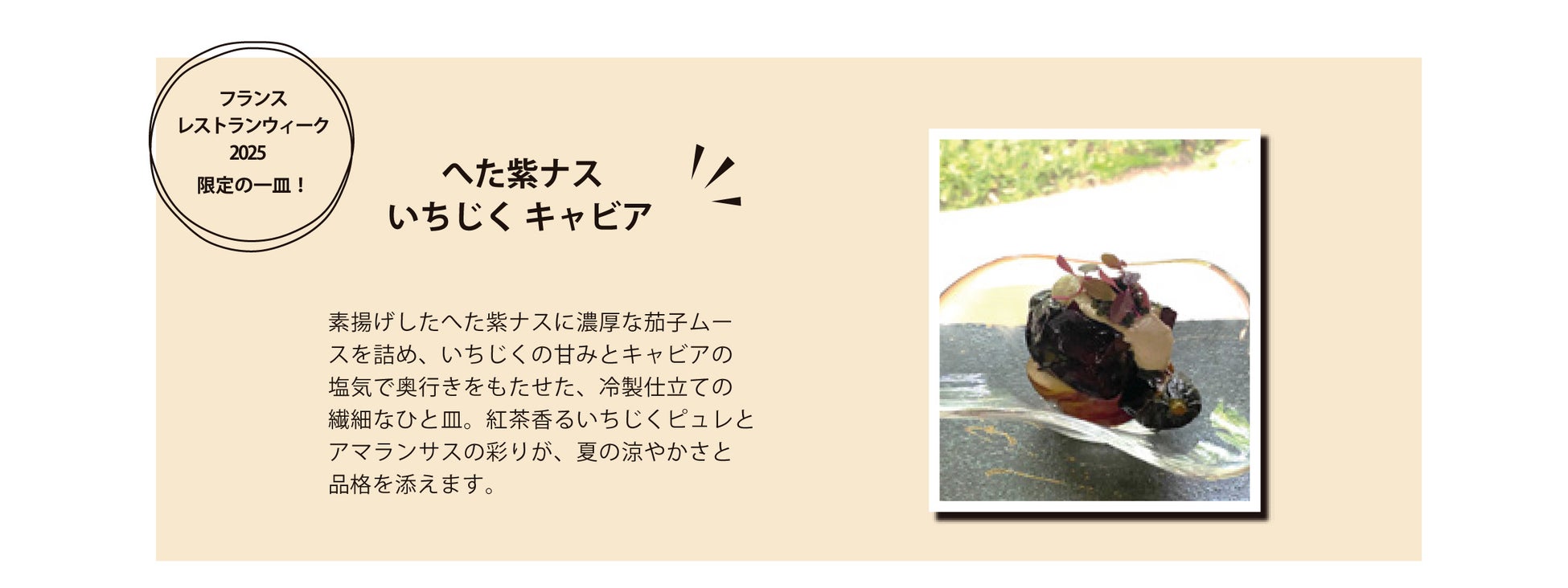限定の一皿! 多田さんは、全国でもわずか2名しかいないヘタ紫茄子の生産者のひとりです。 地元の料理屋からも高い評価を受ける、こだわりの農家さんとの出会いに恵 まれました。料理人として、〝加賀野菜を紡ぐ〟ことで地域を活性化していき