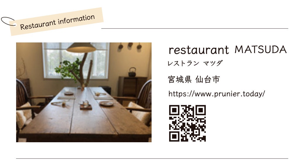 フランス料理の伝統的な技法をベースに、宮城を中心とした地域の旬の食材や自家栽 培の素材を取り入れ、自由な発想でコース料理を作っています。食材はすべて生産者 と直接やりとりし、そのつながりや信頼関係をとても大切にしています。土地が育ん だ食材そのものの魅力を、感じたままに引き出すことが私の料理の最大のテーマで す。また、お客様の食事のひとときを心地よく支える「黒子」のような存在でありたい と願っています。