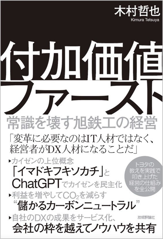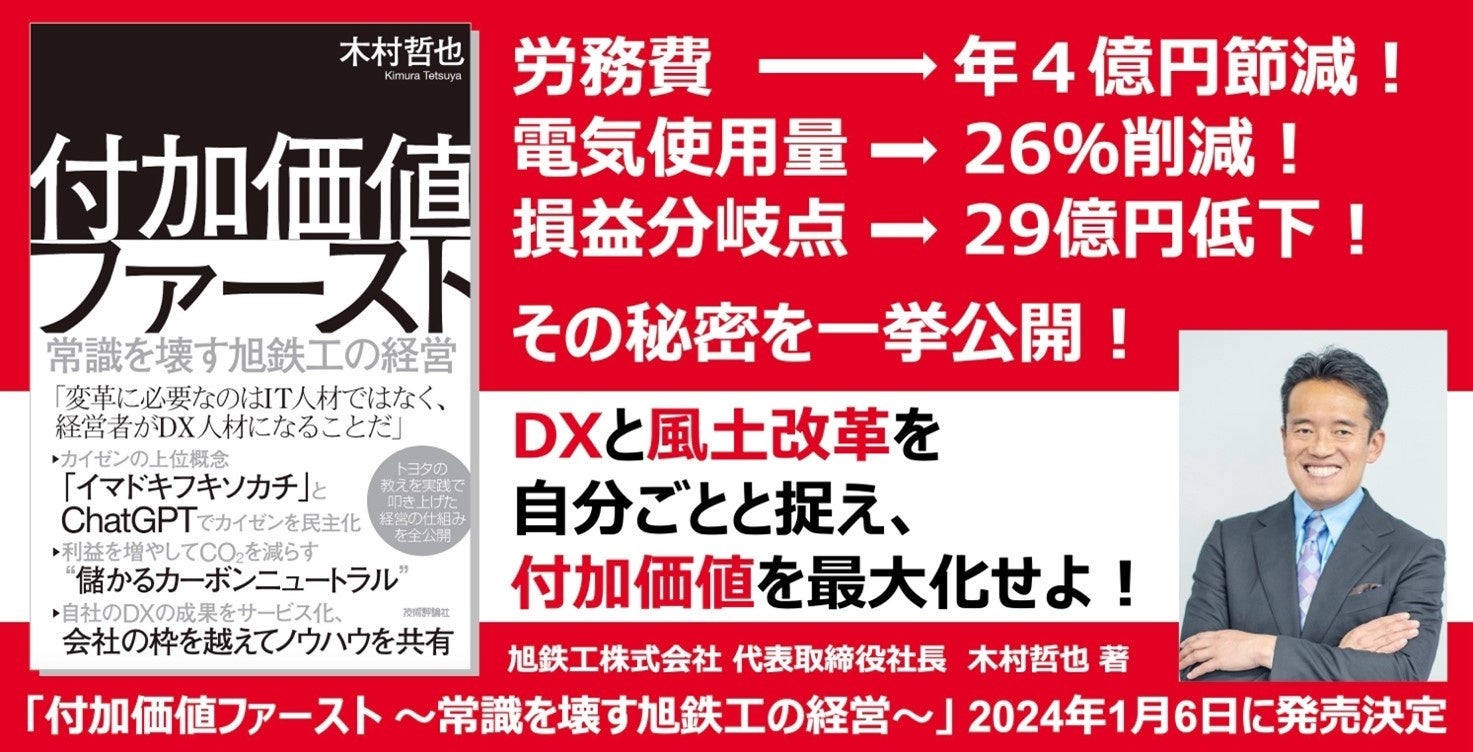 「人には付加価値の高い仕事を」をブランドコンセプトに、トヨタ系1次サプライヤーとして自動車部品製造に取り組む旭鉄工株式会社(本社:愛知県碧南市、代表取締役社長:木村哲也、以下:旭鉄工)は、代表・木村の書籍「付加価値ファースト〜常識を壊す旭鉄工の経営~」が2024年1月6日に技術評論社より発売開始となることをお知らせします。