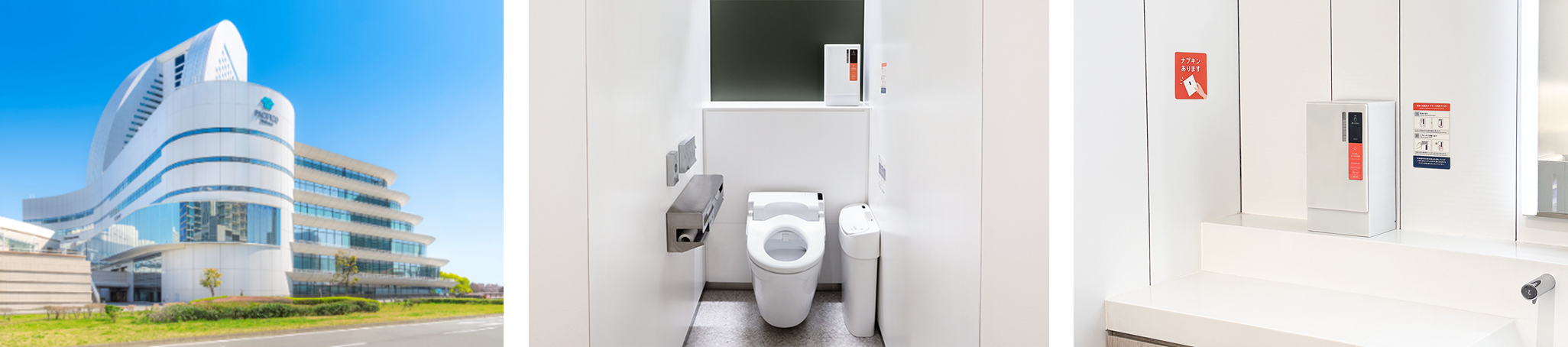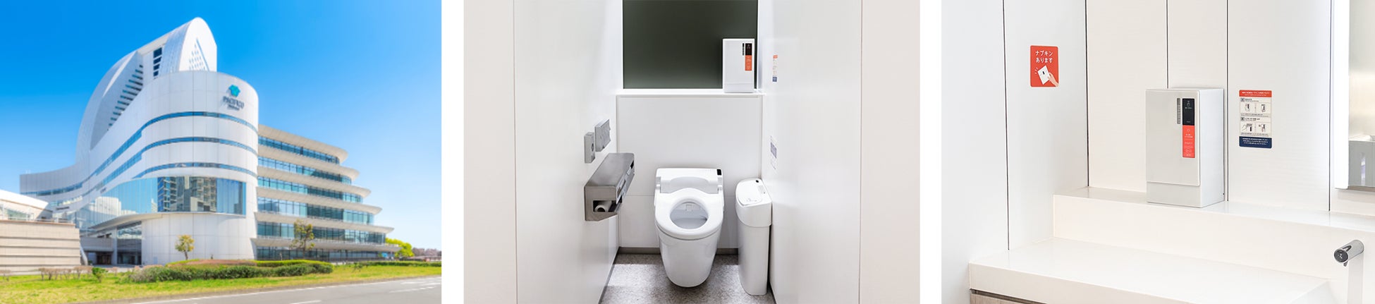 左から、「パシフィコ横浜会議センター」外観、トイレ個室内の設置イメージ、洗面スペースの設置イメージ
