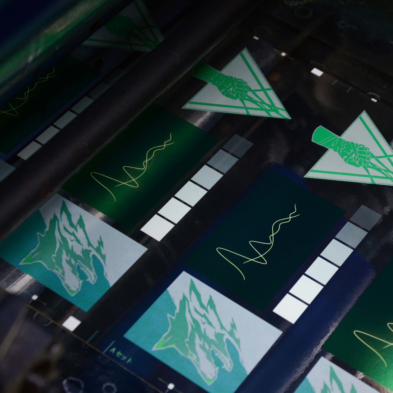 印刷では、鏡のような反射を放つメタリックな質感に、UV硬化する透明インクを用いた特殊加工「リオトーン」を組み合わせました。それにより生まれる繊細な砂目の質感を部分的に加えることで、他では見ることのできない個性を実現。エンブレム本来の色味を損なうことなく、金属感と存在感を引き立てます。